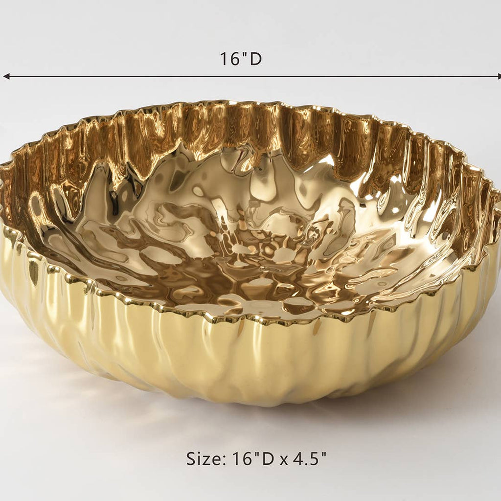Extra Large Shallow Bowl in Mascali D'oro. A simple and elegant serving piece for crowd pleasing dishes like paella, chicken piccata and fettuccini alfredo. A perfect countertop piece to display fresh fruits or vegetables! Striking and elegant gold-tone titanium finished high-fired porcelain. Food safe, tarnish free, dishwasher safe, oven safe to 500°. Easy Care.