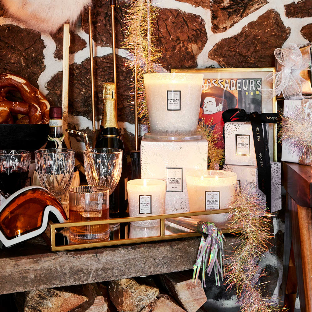 Pop a bottle of Voluspa’s finest blend, it’s time to celebrate! A mix of beautiful aromatic complexity, Sparkling Cuvée opens with vivacious fruit tones of Sparkling Wine, Pomelo and Red Currant. The effervescence of Sparkling Wine is the heart of the celebration, with bubbles cascading to the surface, dancing and mingling with juicy Nectarine and Bulgarian Rose Petals. A velvety, smooth finish of Woody Oak serves as the perfect stage for this aromatic affair. Raise a glass of Sparkling Cuvée, your olfactory aperitif for every unforgettable occasion.