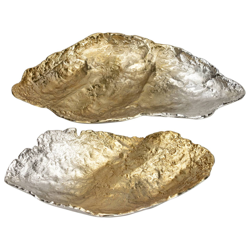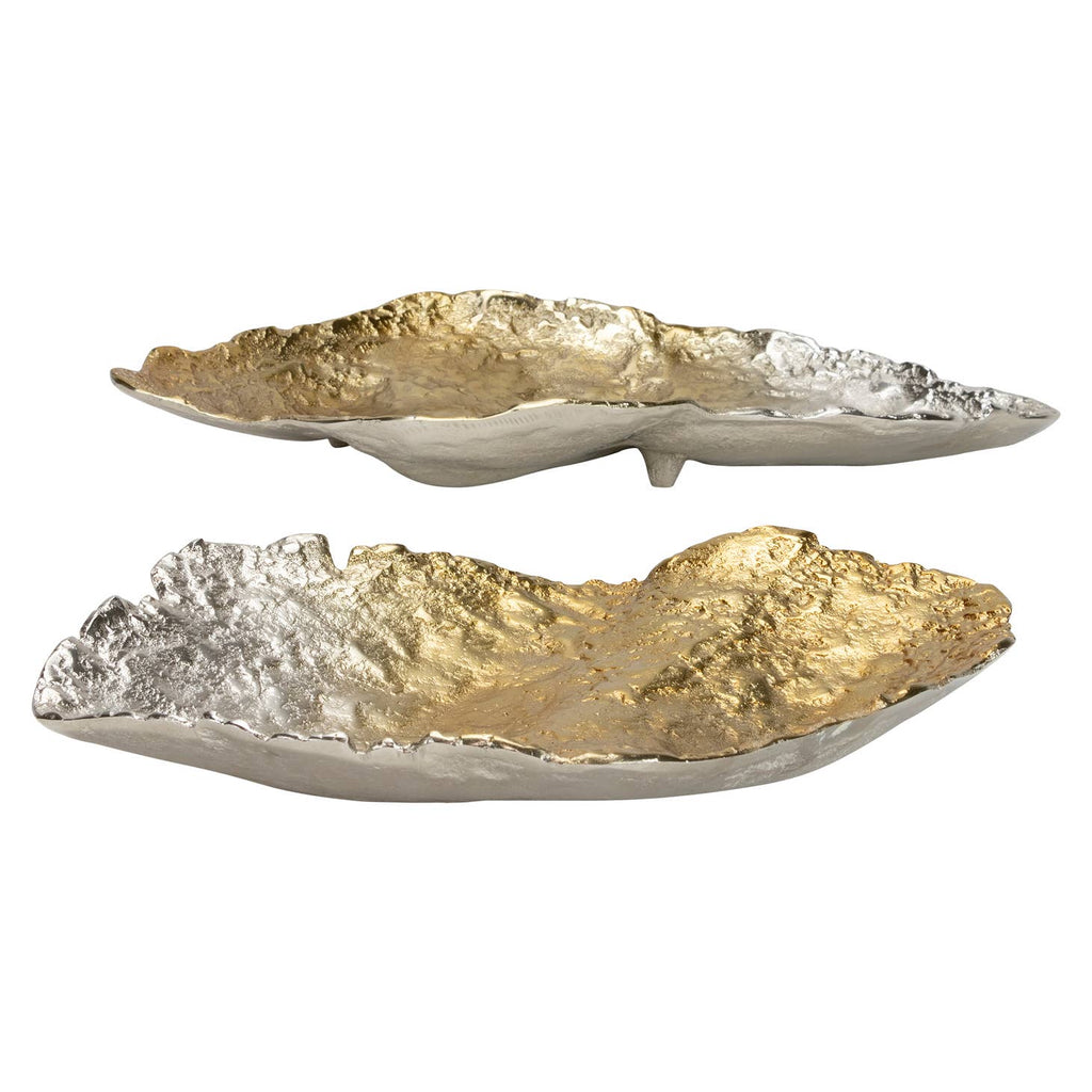 Discover the sophistication of the ellsworth ombre trays, a perfect addition to your home décor and an elegant touch to your interior design. These lovely trays come in a set of two, featuring an abstract shape that perfectly blends with any environment. Crafted from hammered metal, they display a beautiful ombre effect that shifts from rich gold to elegant silver. The trays are available in two sizes- 21Lx11Wx3H and 15.5Lx9.5Wx2.5H, ideal for showcasing your decorative items. Moreover, the small feet on the bottom add an extra touch of charm and stability. Dive into elegance with the ellsworth ombre trays!