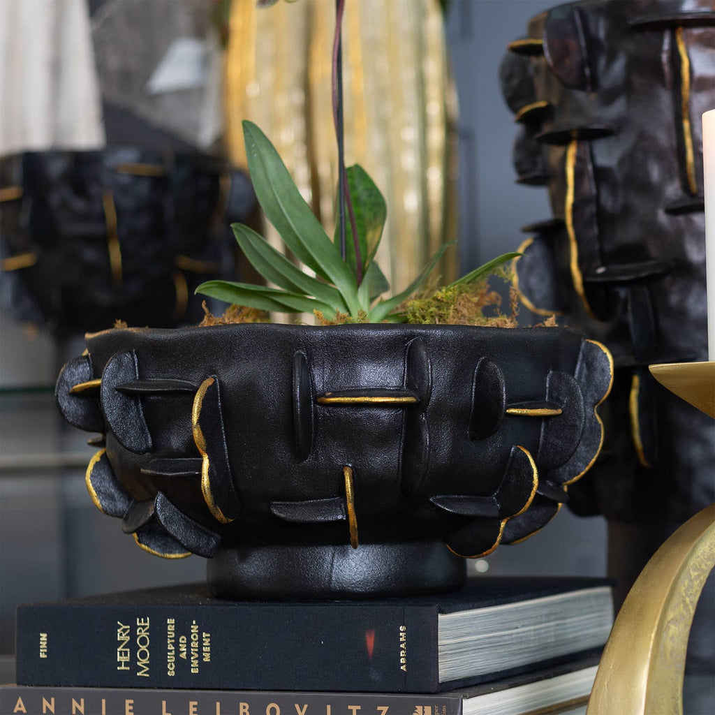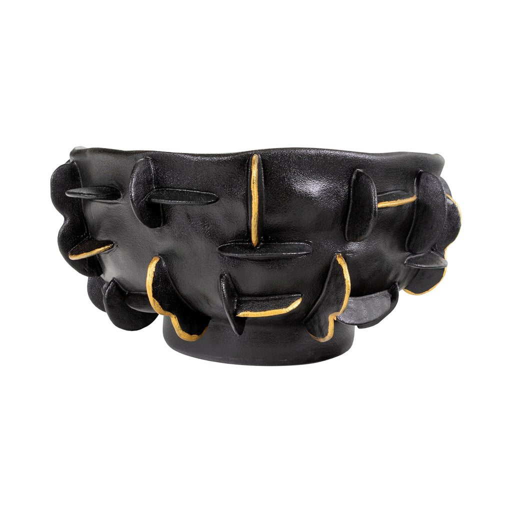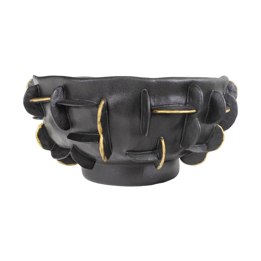 The calatrava bowl is a mesmerizing masterpiece that effortlessly transforms any space into a haven of elegance. Crafted from exquisite black porcelain, adorned with luxurious gold accents and tastefully embellished with geometric shapes, this 13Dx6.5H round beauty is truly one-of-a-kind. resting on a pedestal base, it commands attention and admiration from every angle. Let your space be defined by sophistication with this unique decorative bowl that speaks volumes about your impeccable taste in interior design.