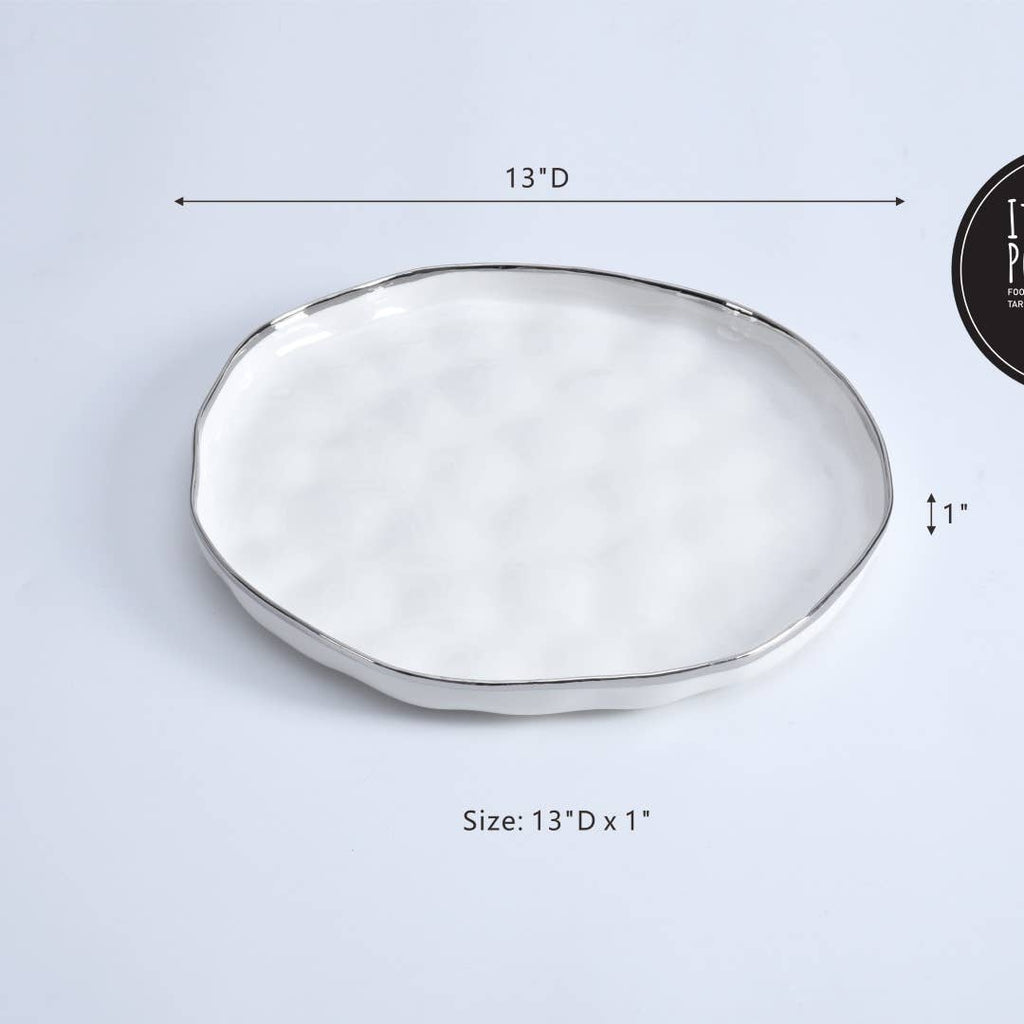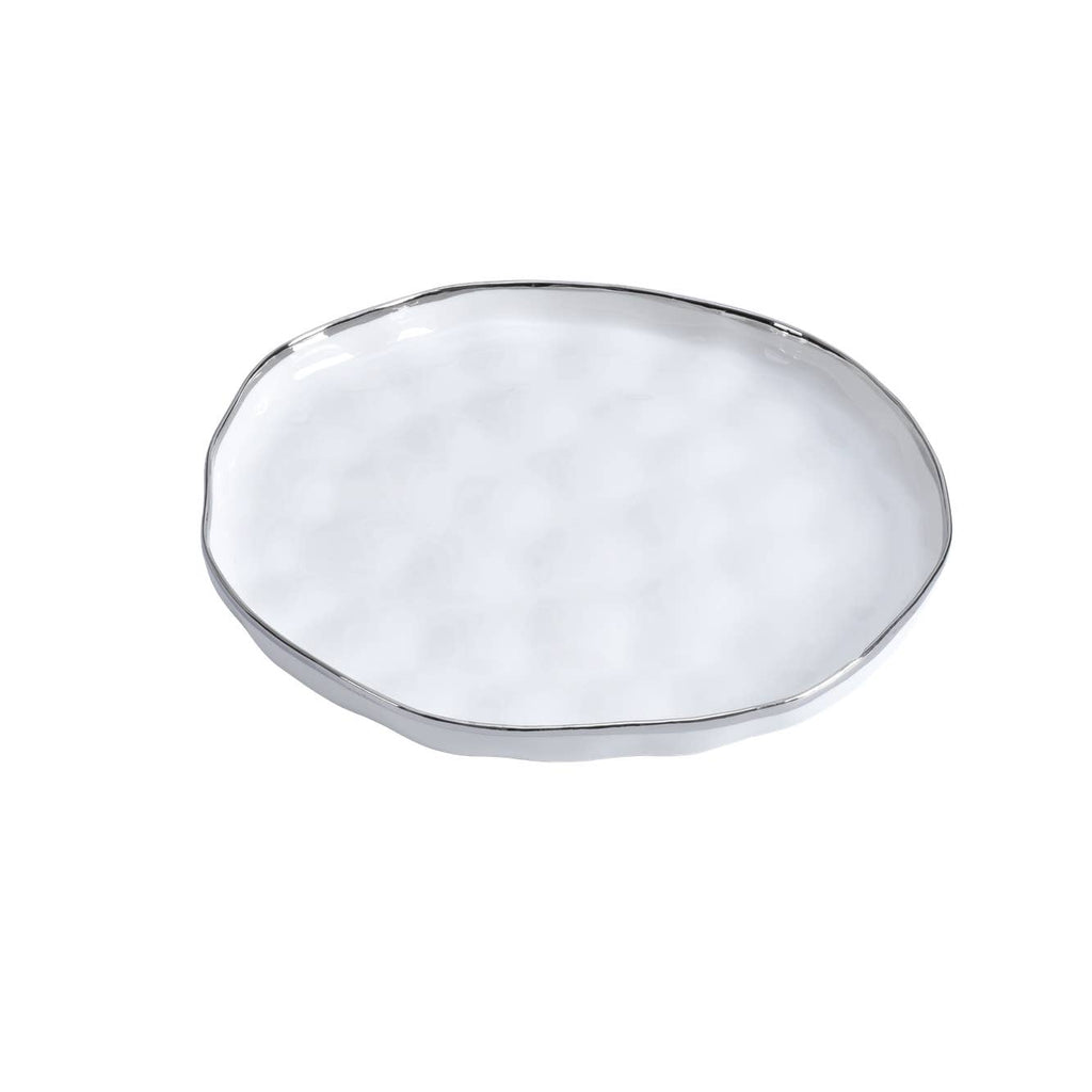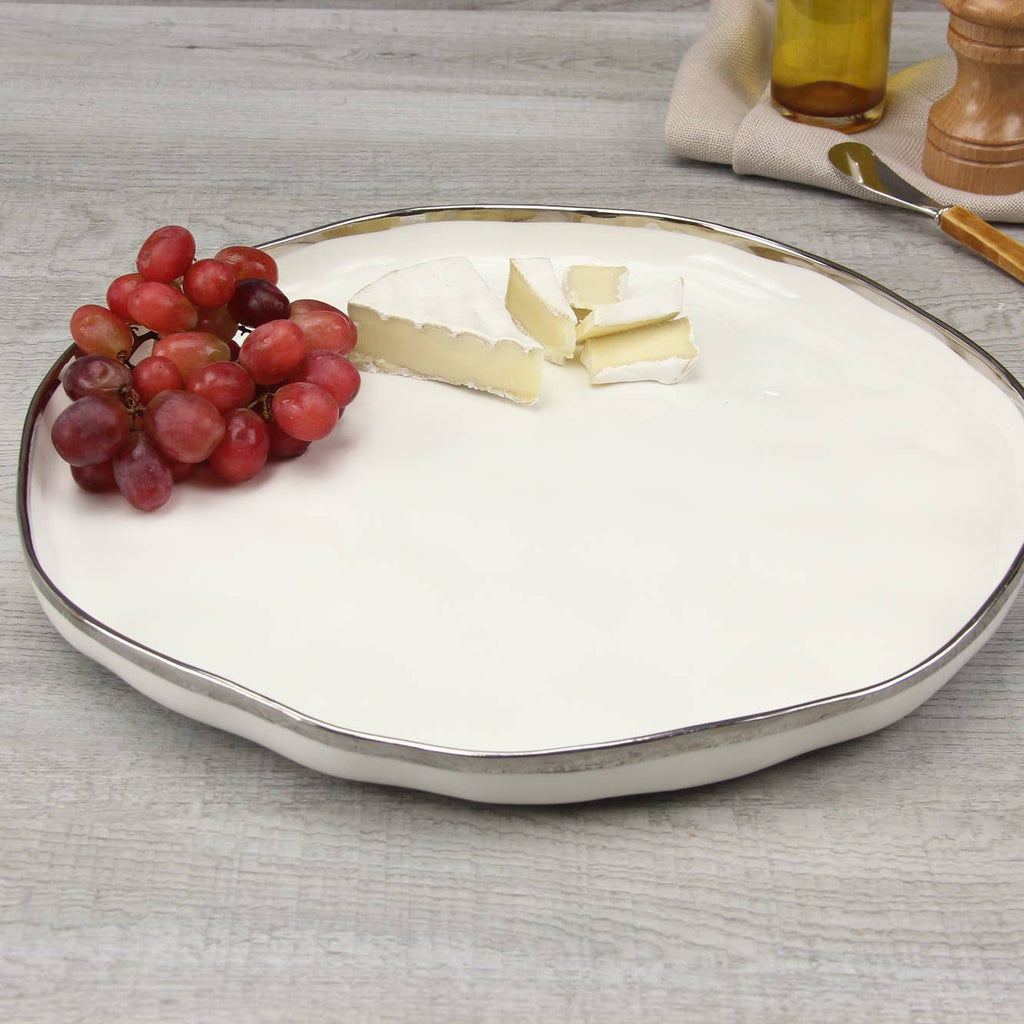 Round Serving Piece in Bianca. An incredibly versatile all-purpose serving platter makes an easy transition from oven to table. Stack our snack or small Bianca bowls on this platter with sauces or dips to create an all-in-one serving piece! Show off delicious main courses or even desserts on this multi-use platter. Gorgeous white porcelain with a delicate silver trim. Food safe, tarnish free, dishwasher safe, oven safe to 550°. Easy Care.
