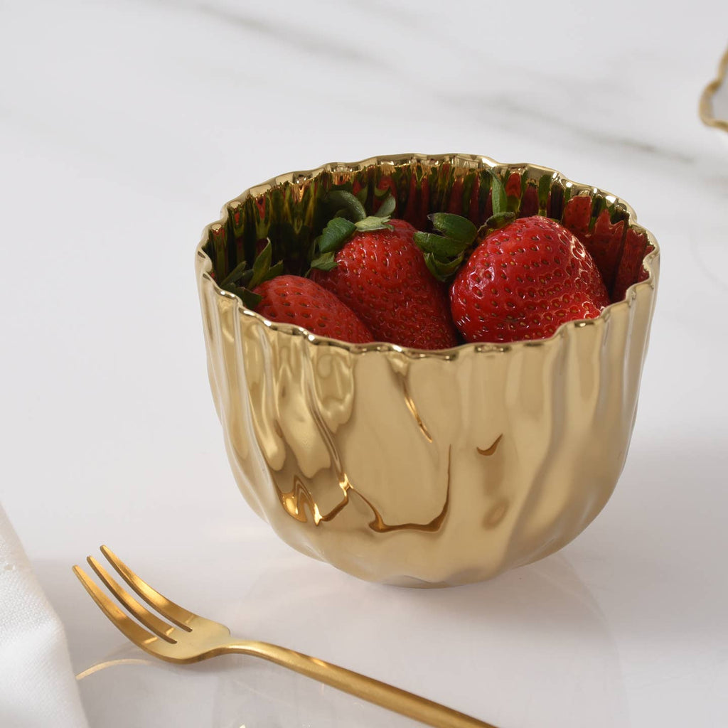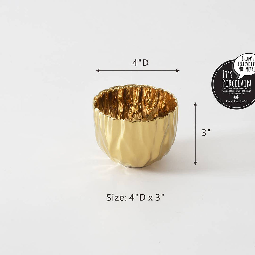 Snack Bowl in Mascali D'oro. Handle all your snacking with style! Great for small nibbles or on a buffet for condiments. Striking and elegant gold-tone titanium finished high-fired porcelain. Food safe, tarnish free, dishwasher safe, oven safe to 500°. Easy Care.