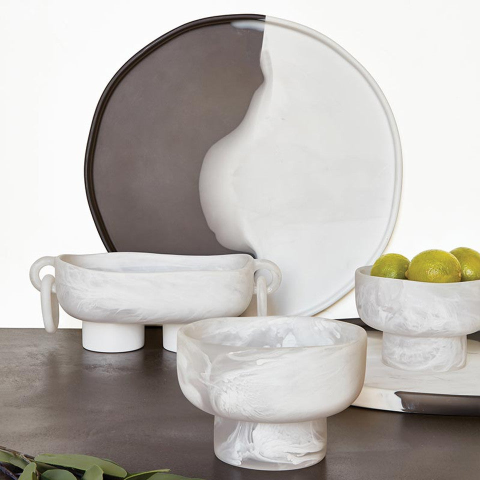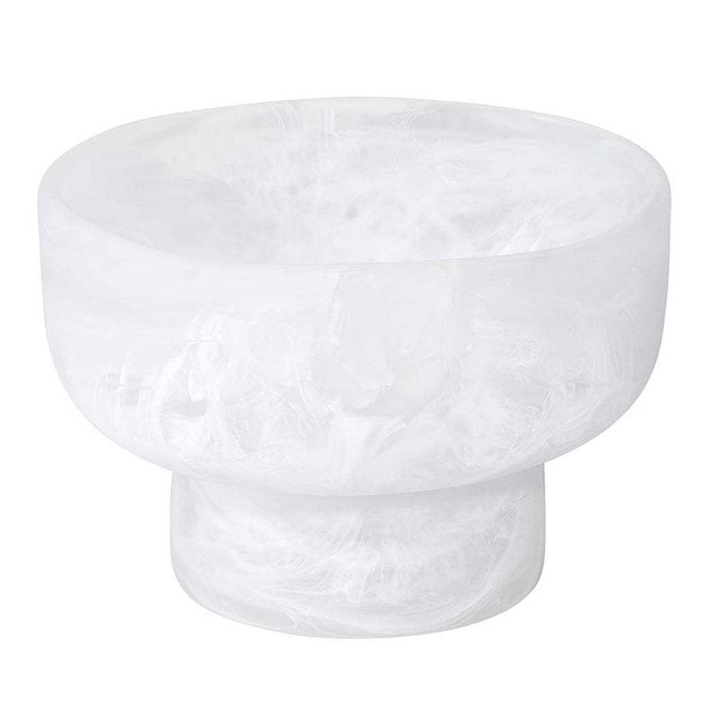 Add a touch of elegance and versatility to your home decor collection with our White Resin Mini Pedestal Bowl. Whether you use it for entertaining or as a decorative accent, this charming piece is sure to elevate any space in your home. Each resin piece has variation in swirled color.