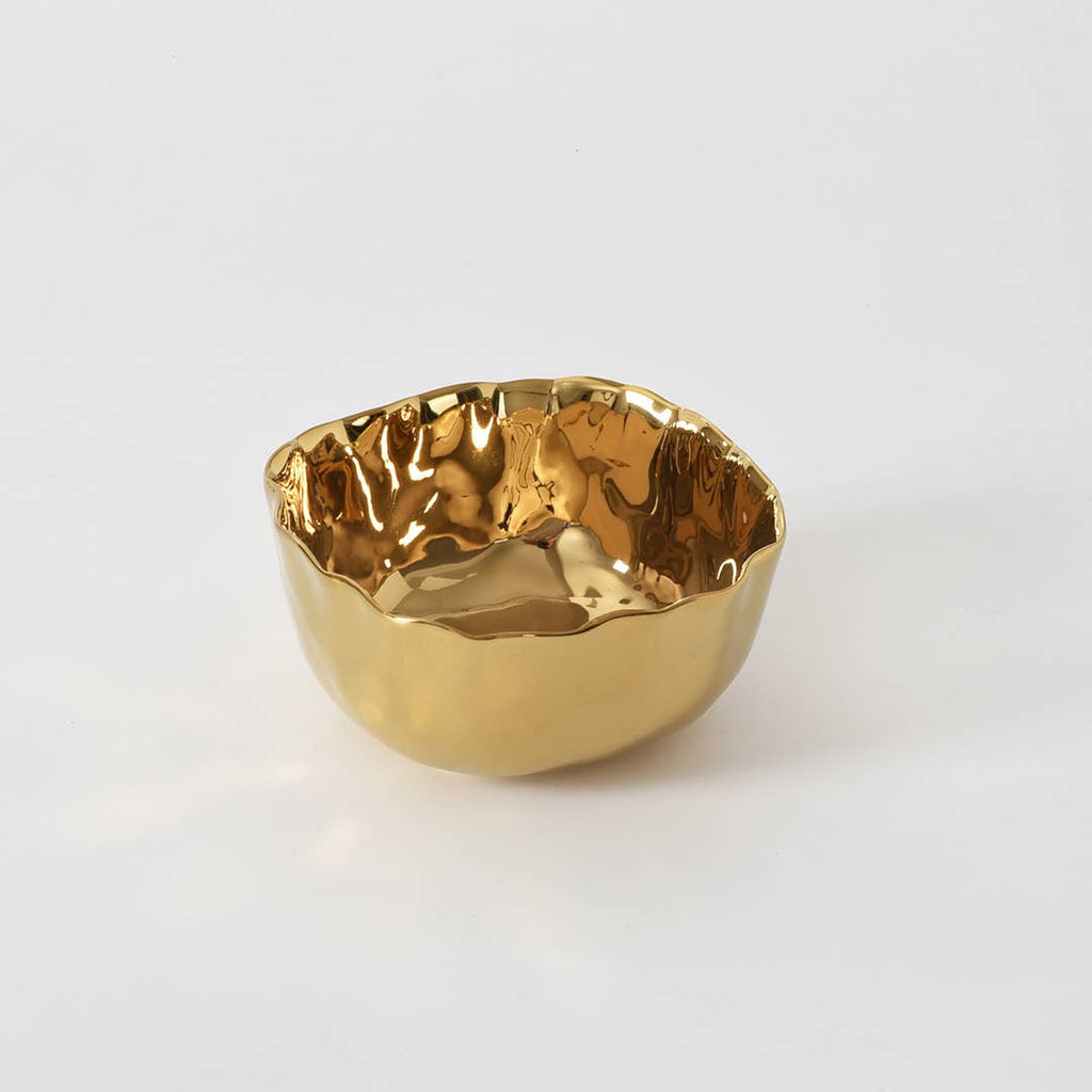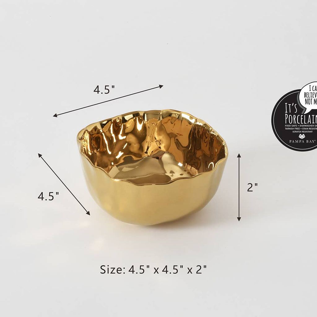 Snack Bowl in Portofino. Handle all your snacking with style! Great for small nibbles or on a buffet for condiments. Striking and elegant gold-tone titanium finished high-fired porcelain. Food safe, tarnish free, dishwasher safe, oven safe to 500°. Easy Care.