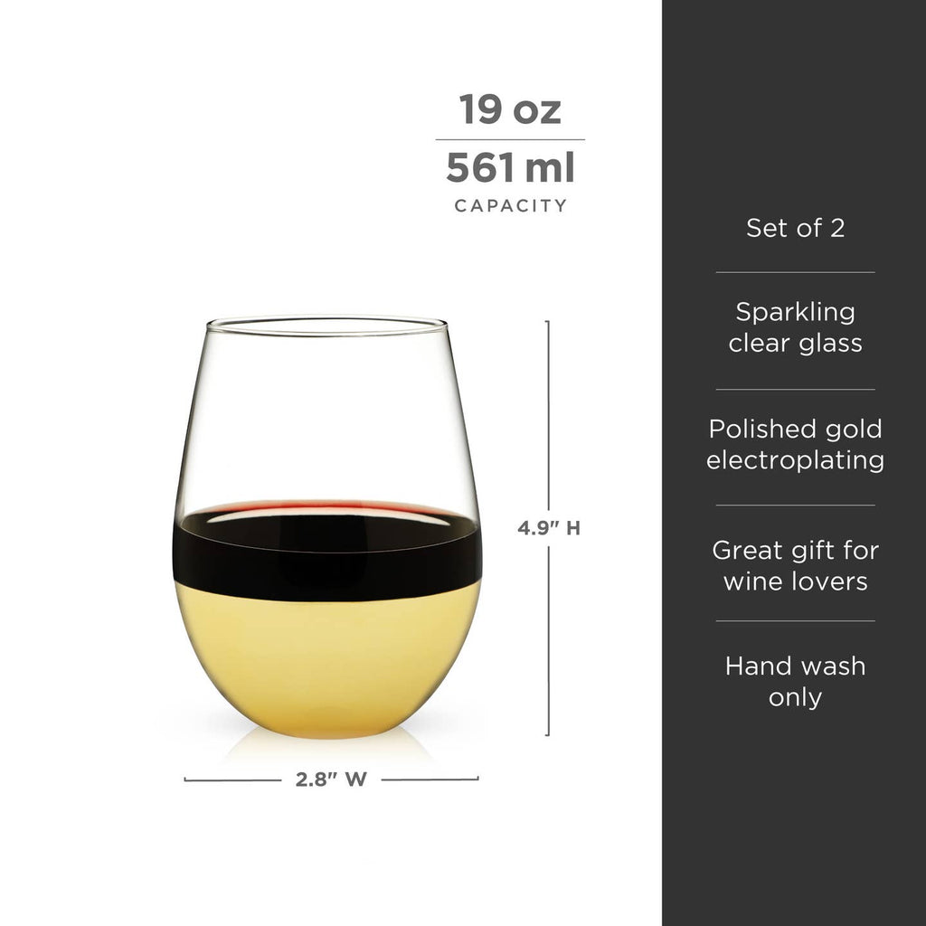 Polished gold cuts across the smooth surfaces of this wine glass duo, adding a spark of metallic intrigue to an already elevated set of glassware. Fashioned from crystal-clear glass, each tumbler accommodates 19 oz, making them exquisite containers for your favorite cocktail or carefully selected vintage.