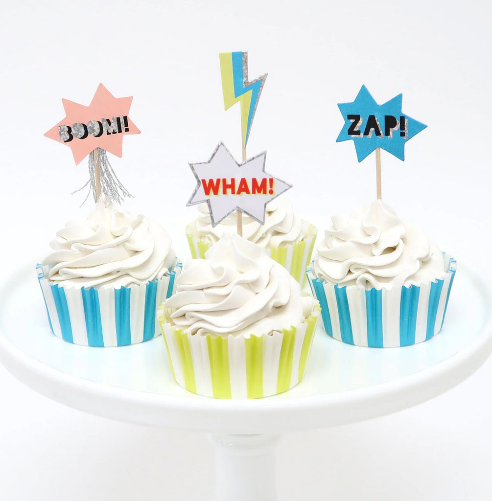 This cupcake kit is really super! It features striped cases, in 2 colorways, and toppers with bright colors and embellishments.