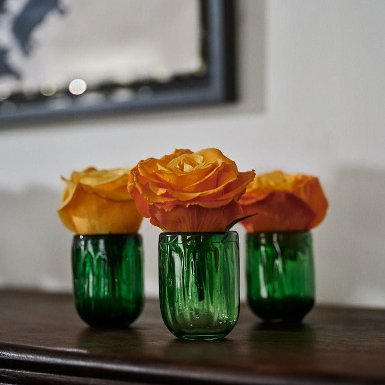 Festive set of 2 votives with acanalada and an etched rim . . . Green for vitality and harmony . . .