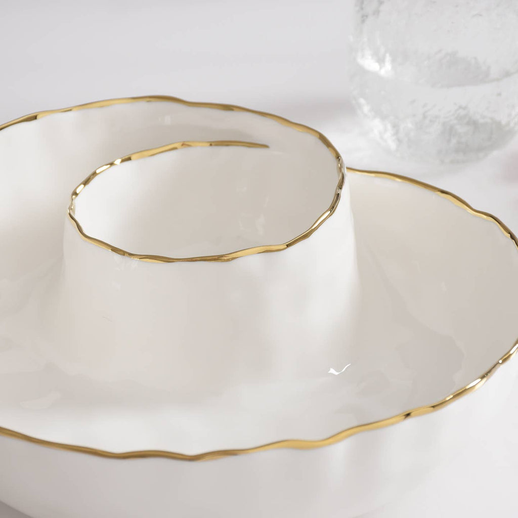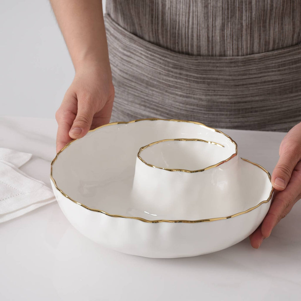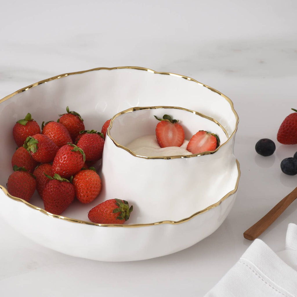 Chip and Dip in our Portofino Collection. Perfect for any dip combo : hummus and pita, salsa and tortilla chips, veggies and ranch or our favorite berries and whipped cream! Gorgeous white porcelain with a delicate gold trim. Food safe, tarnish free, dishwasher safe, oven safe to 500°. Easy Care.